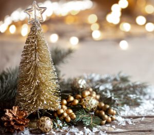 Christmas cozy background with decor details, snow and blurry lights copy space.